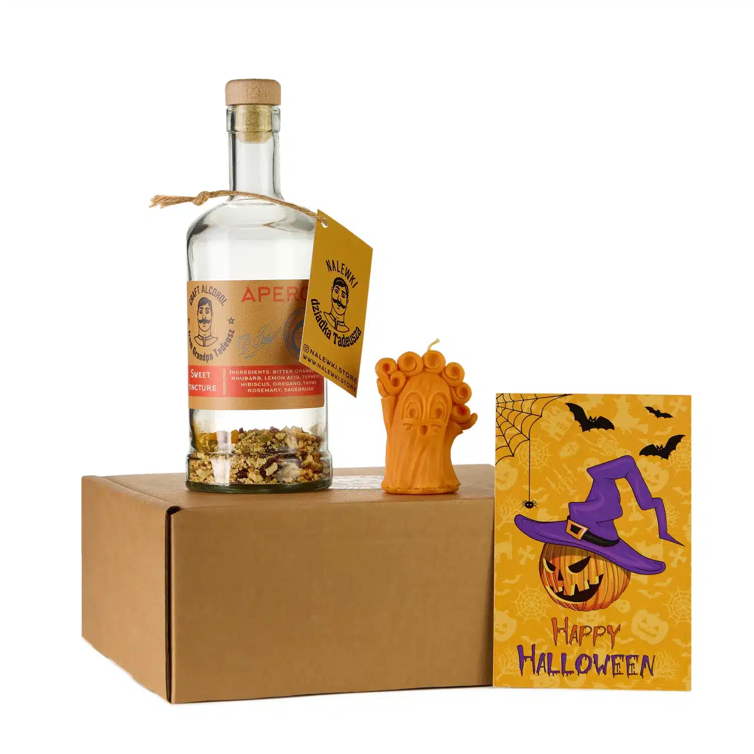 Zestaw „Halloween” to idealny prezent, który wprowadzi magiczny nastrój w tę pełną tajemnic noc! W zestawie znajdziesz zestaw do przygotowania nalewki o smaku Aperol, który zaskoczy swoim oryginalnym smakiem. Uzupełnieniem jest pachnąca świeca do wyboru: „Dynia” dla przytulnej atmosfery lub „Woooo” dla fanów prawdziwie mrocznego klimatu. Całość dopełnia halloweenowa kartka, na której możesz napisać swoje najstraszniejsze życzenia. Odkryj magię Halloween z tym oryginalnym zestawem!