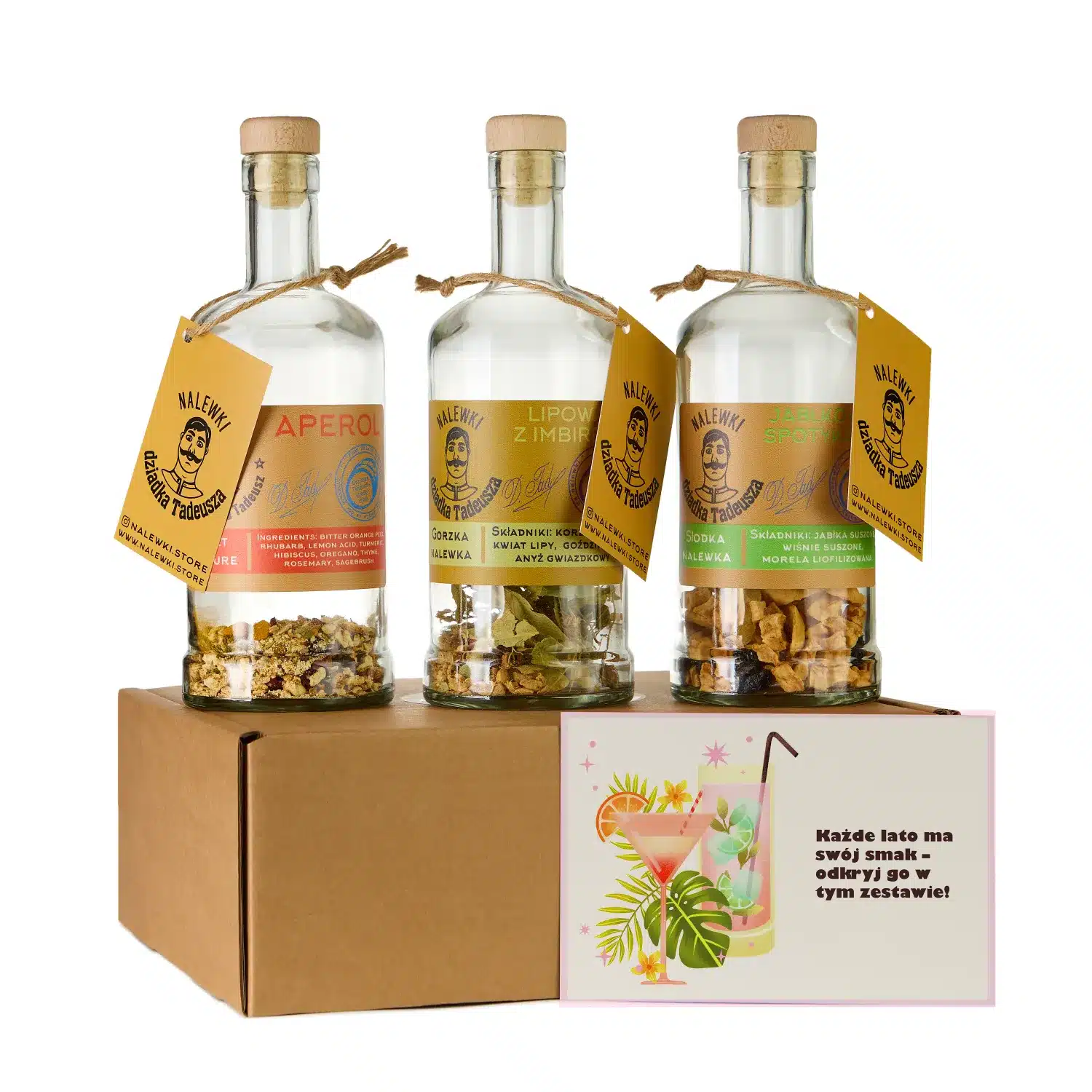Zestaw letnich nalewek to doskonały pomysł na upominek – idealny dla każdego, kto uwielbia orzeźwiające smaki i ceni domowe trunki. Pozwól swoim bliskim eksperymentować z lekkimi, owocowymi nalewkami, które doskonale sprawdzą się podczas letnich spotkań w gronie przyjaciół i rodziny. Podaruj prezent, który będzie nie tylko kulinarną przyjemnością, ale także symbolem beztroskich chwil, radości i letniego relaksu!